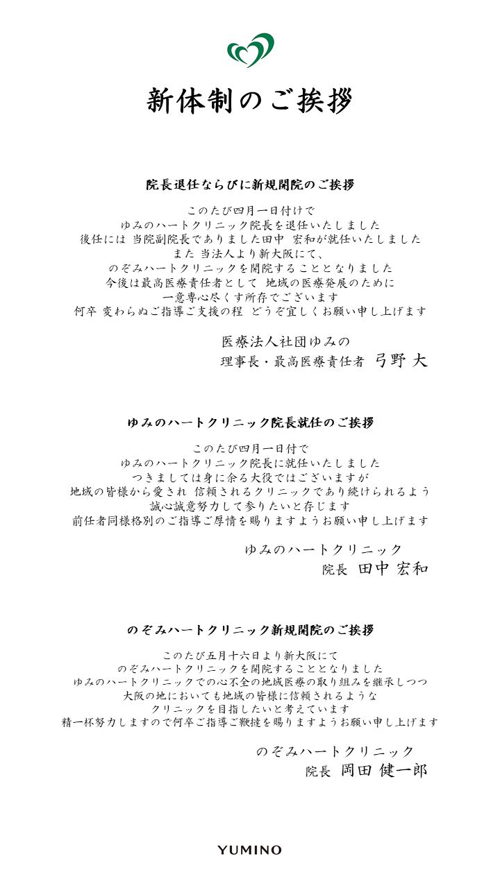 ニュース 医療法人社団ゆみの 医療法人社団ゆみの 活動報告 2020年07月02日 日本経済新聞に当法人の取り組みが掲載されました 医療法人社団ゆみの 企業活動 2020年05月25日 特別企画:心不全チーム医療カンファレンスを開催いたします 医療法人社団ゆみの 企業活動 2019年10月25日 第17回心不全チーム医療カンファレンスを開催いたします 医療法人社団ゆみの 2019年05月10日 渋谷院 開院のお知らせ 医療法人社団ゆみの 2018年04月01日 新体制のご挨拶 年別 2022年 2021年 2020年 2019年 2018年 2017年 2016年 2015年 2014年 2013年 カテゴリー別 ニュースリリース 企業活動 医療法人社団ゆみの 採用 新型コロナウイルス感染症 活動報告 診療 ゆみのハートクリニック ゆみのハートクリニック渋谷 のぞみハートクリニック