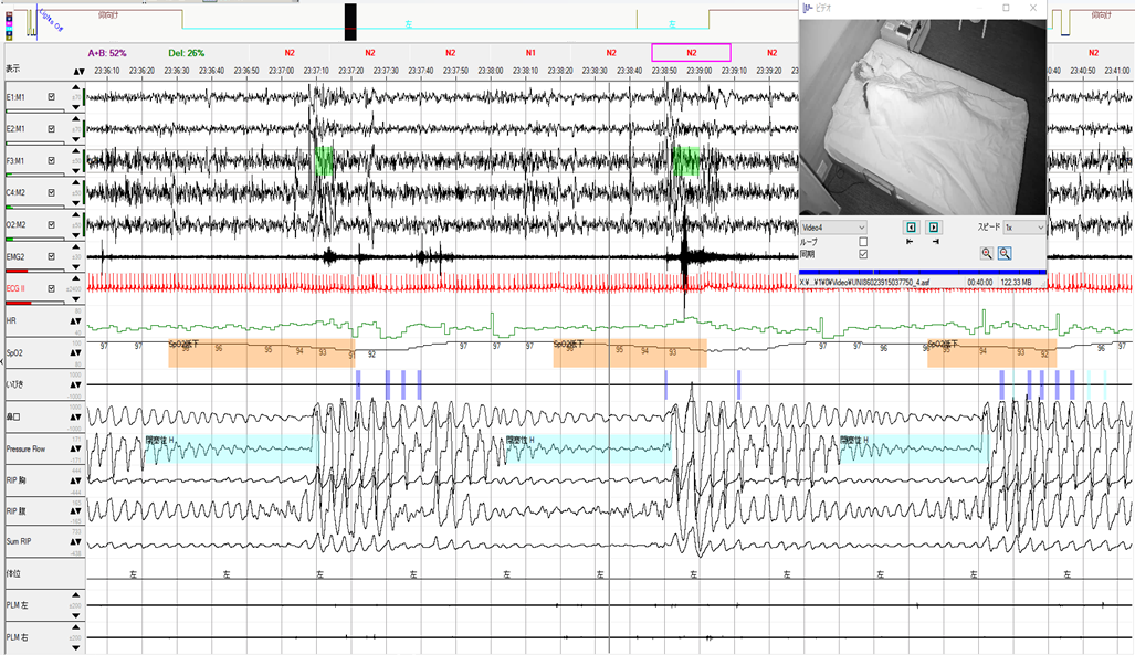 60歳台 女性 身長:155㎝ 体重:45kg BMI:18.7 ESS:5 他施設の人間ドックで簡易検査を行い、REI=68.8と重症の結果に驚いて、精査希望で来院されました。夜間頻尿で泌尿器科に通院、服薬にて3回から1回に減少したそうです。日中過眠はなく、いびきもたまに指摘されるくらい、SASとしての自覚症状はないそうです。当院で行った診断PSGの結果は…