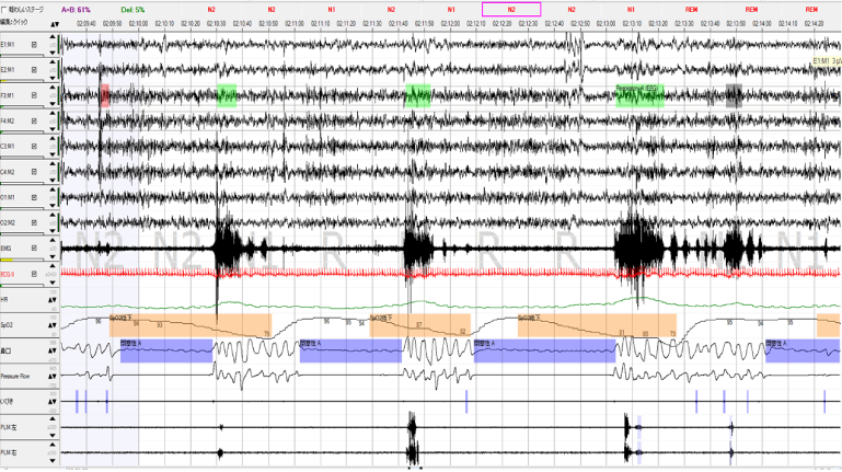 60歳台 男性 身長:171㎝ 体重:70.5kg BMI:24.3 ESS:未検慢性心不全、拡張型心筋症、心室頻拍などの既往があり、埋め込み型除細動器を留置されています。不眠の主訴もあり、デエビゴを不眠時に服用されています。心疾患と高血圧があり、簡易検査を施行したところ、REI=28.4で診断PSGを行いました。その結果、AHI=40.8回/時間と重症の無…